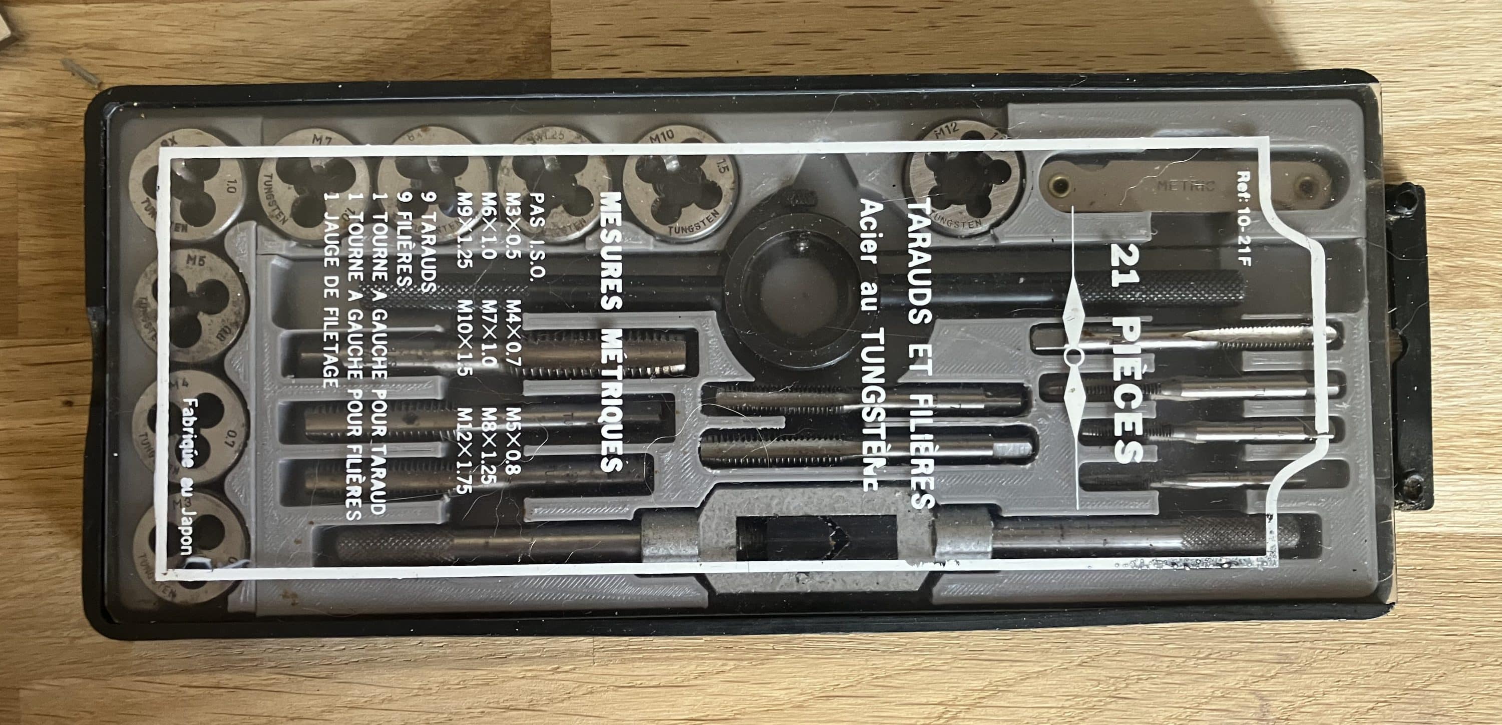Le plastique orange « tout fin » avait mal vieilli alors je me suis décidé à donner un nouveau rangement à mes tarauds et filières. Je ne m’en sers pas tous les jours mais la dernière fois était sur l’imprimante que j’ai reçu qui avait un taraudage « foiré », un petit coup de taraud et hop, c’est reparti, c’est bien pratique.