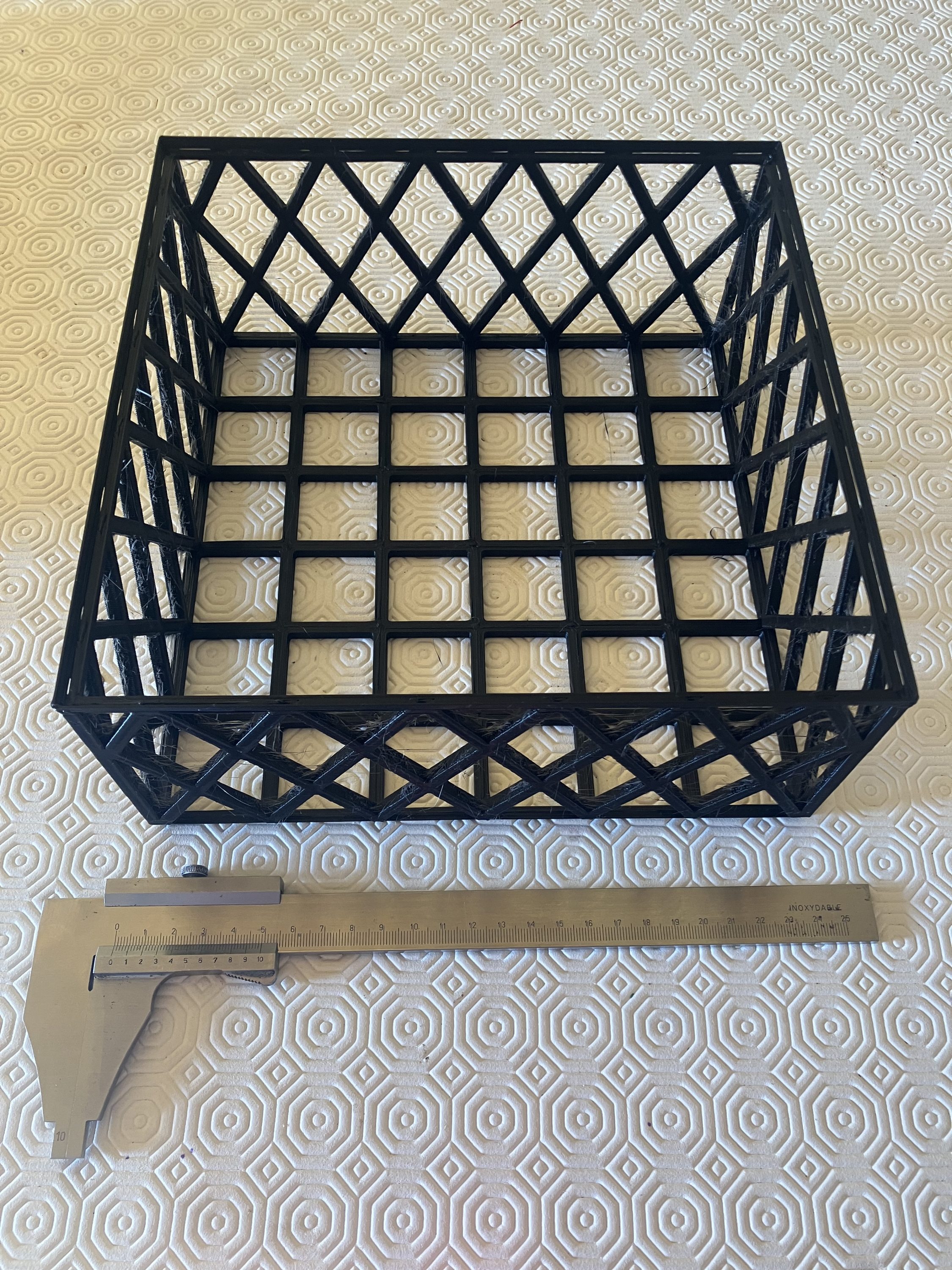 J’ai mis le pied à coulisse en référence pour bien se rendre compte de la dimension : 240×240120. Même avec une buse de 0,8 et imprimé en 0,6 de hauteur de couche, il aura fallu 4 heures pour imprimer ce modèle qui devait être 2 fois plus haut à la base. Le 8 heures m’a rebuté et j’ai revu mes prétentions à la baisse. 225 gr de Pla +.