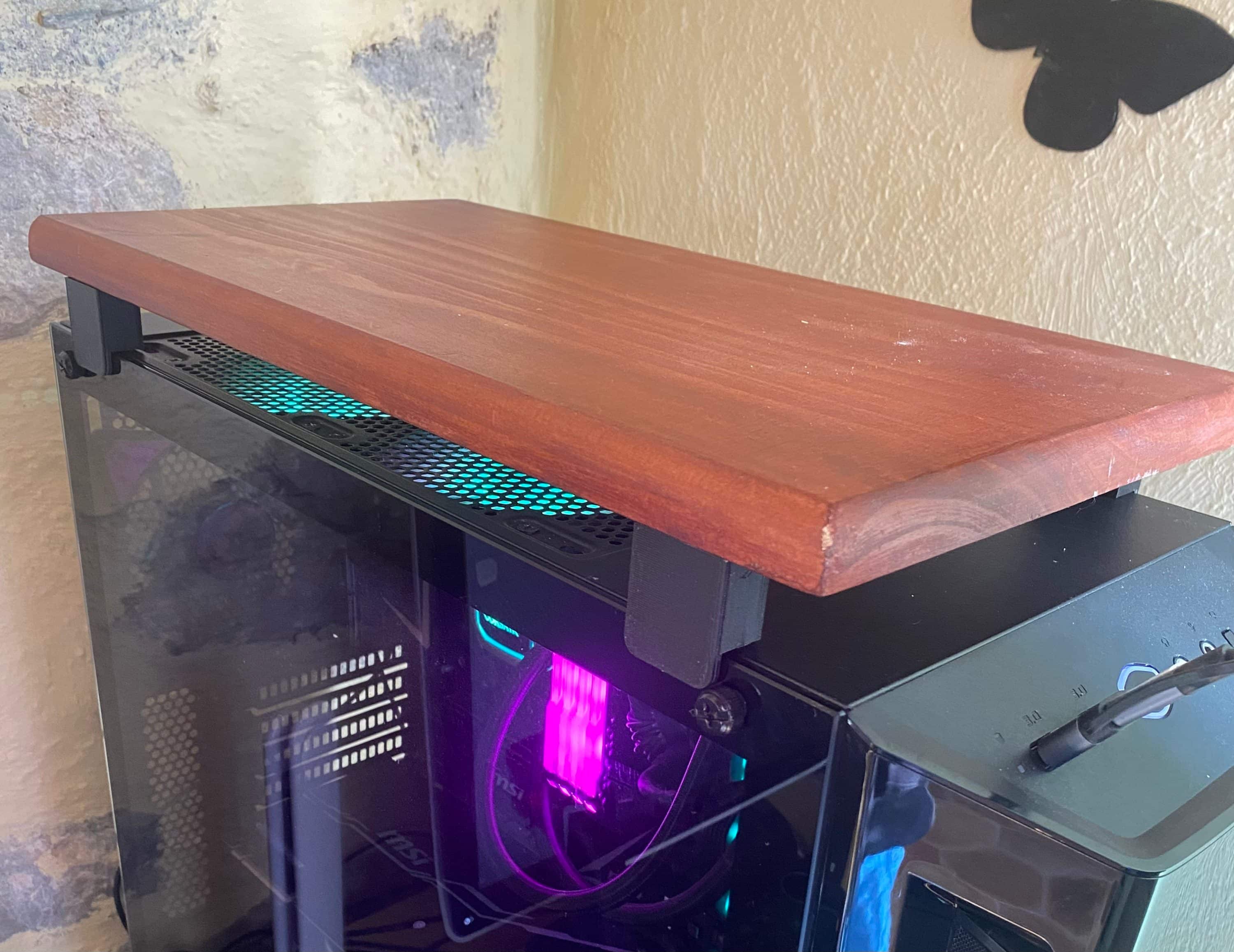 Dans une vielle maison, les murs « à la chaux » relarguent beaucoup de poussière et de particules d’enduit. Il en entrait pas mal dans mon magnifique PC tout neuf et ce n’était pas viable. J’ai coupé une tablette en bois qui pourra me permettre de stocker des bricoles et j’ai imprimé des entretoises pour garder une bonne circulation d’air.