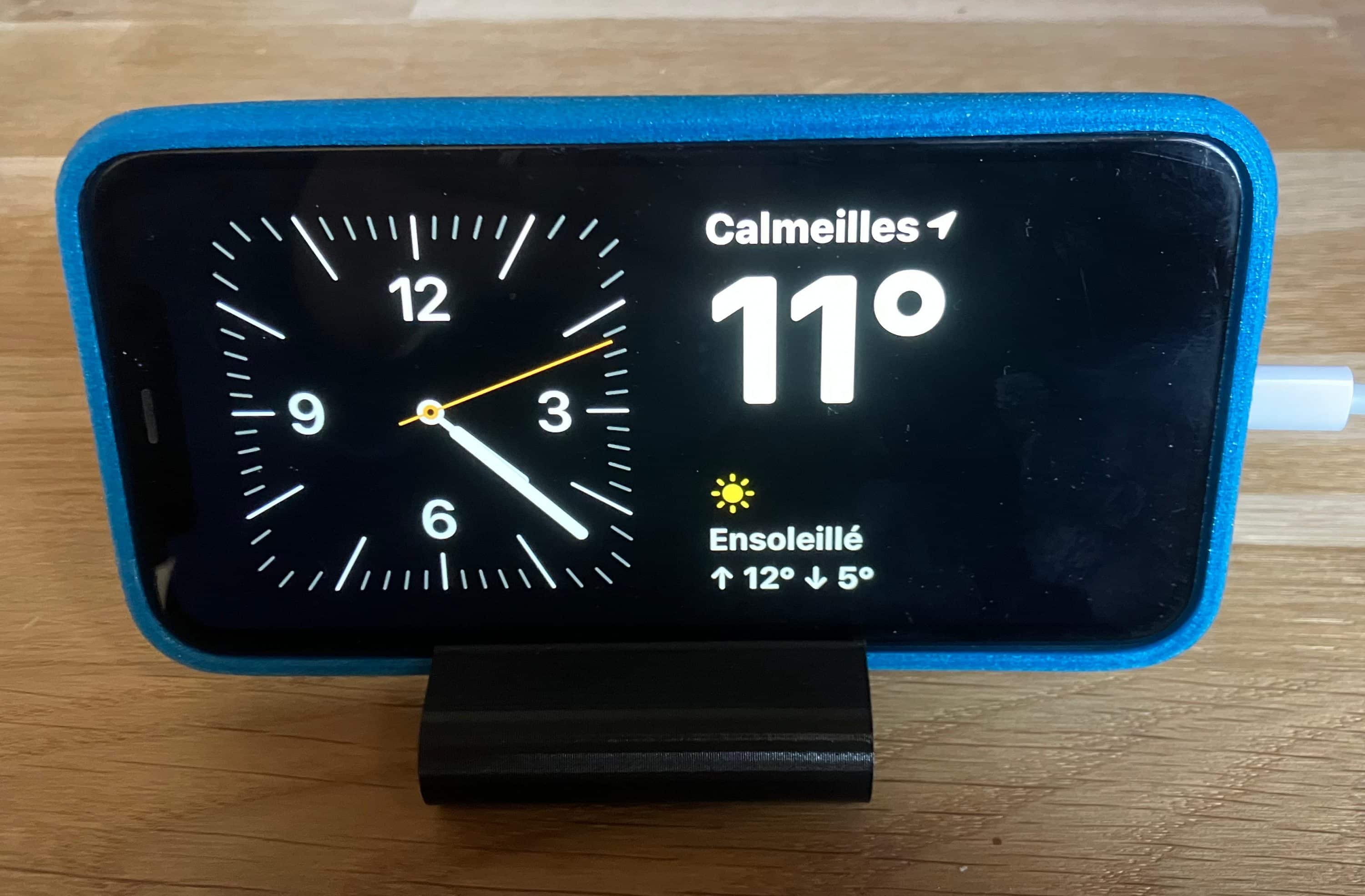 Cette fonctionnalité « Réveil » des iPhones en recharge en mode paysage (horizontal) me plait bien, j’ai adapté le support Suédois que j’ai réduit au maximum et agrandi la fente pour poser l’ancien Iphone que Cyril m’a donné avec sa nouvelle protection .