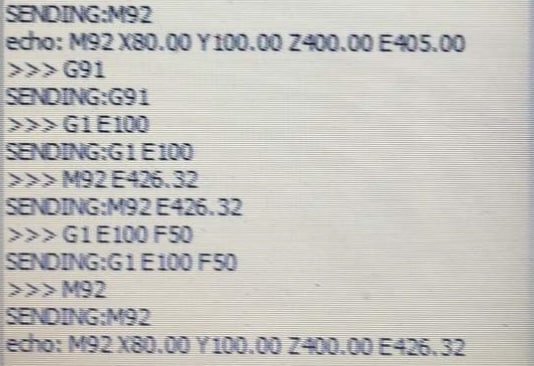 Comme je suis plutôt du genre « ceinture ET bretelles », je recommence l’opération avec l’extrusion et je vérifie que le filament a bien avancé tout juste de 100mm et je vérifie l’enregistrement du paramètre avec M92.